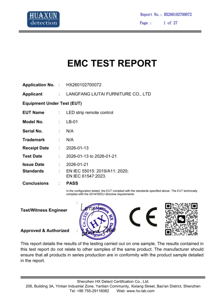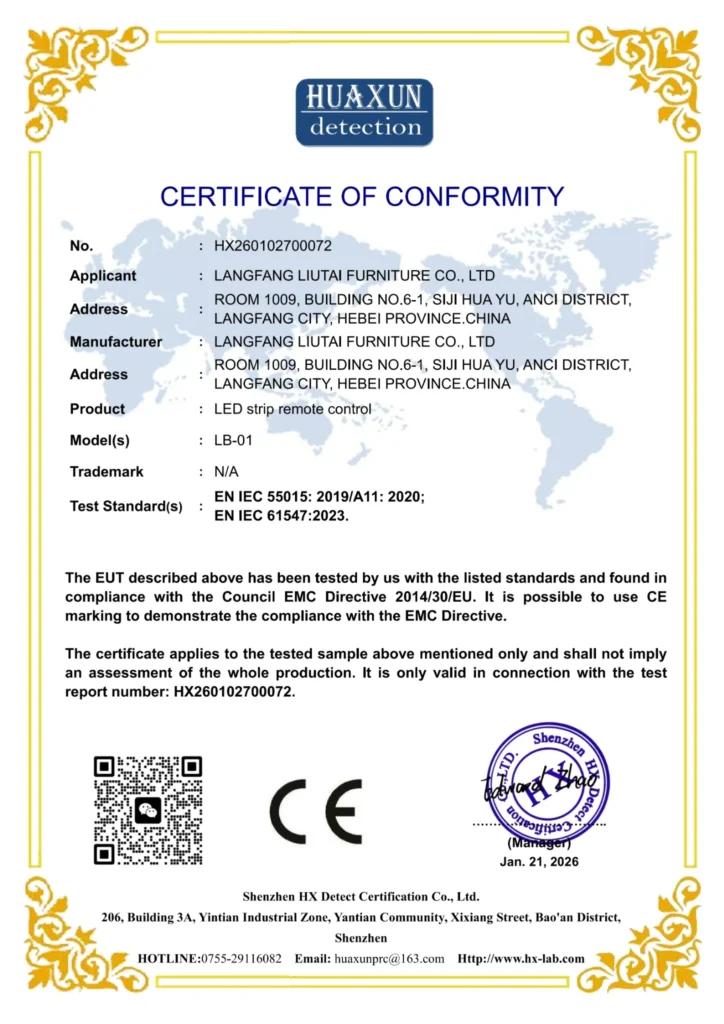 The CE certification ensures that our LED bed frames, including LED strips, power supply, and control box, comply with EU safety, health, and environmental regulations.