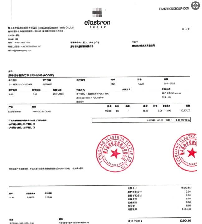 This document is the Purchase Contract with our supplier, which includes the OEKO-TEX certification for the fabric used in our products. The contract confirms that the fabric complies with international standards for safety and environmental impact, and the authorization to use the OEKO-TEX certified materials is granted to us.