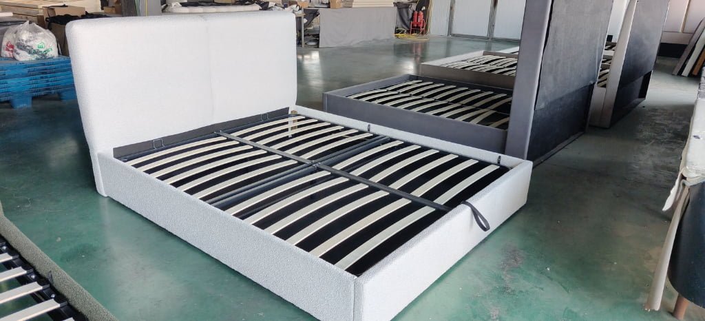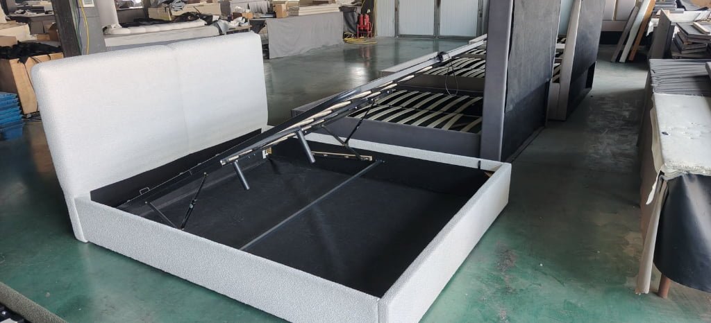 This upholstered storage bed uses a vertically foldable bed base that folds upward and stores behind the headboard, reducing packing volume, improving container loading efficiency, and simplifying installation for bulk orders.